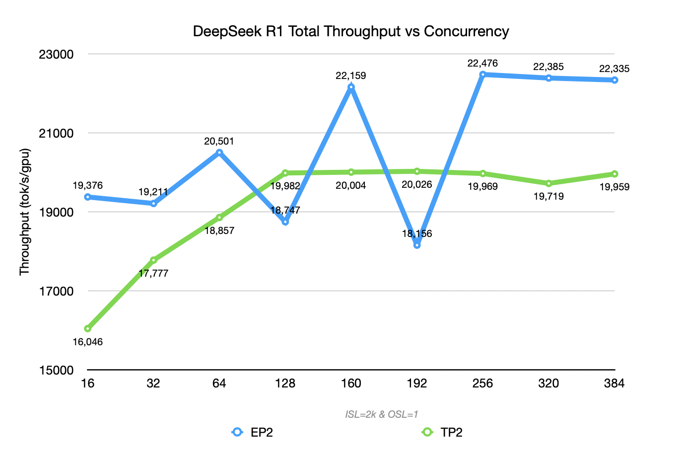 - DeepSeek R1 in EP2 can reach a peak Prefill throughput of ~ 22k TGS.