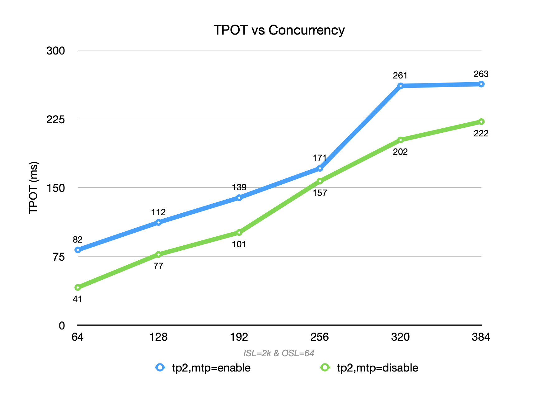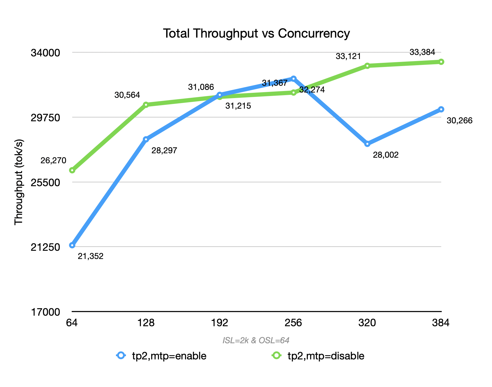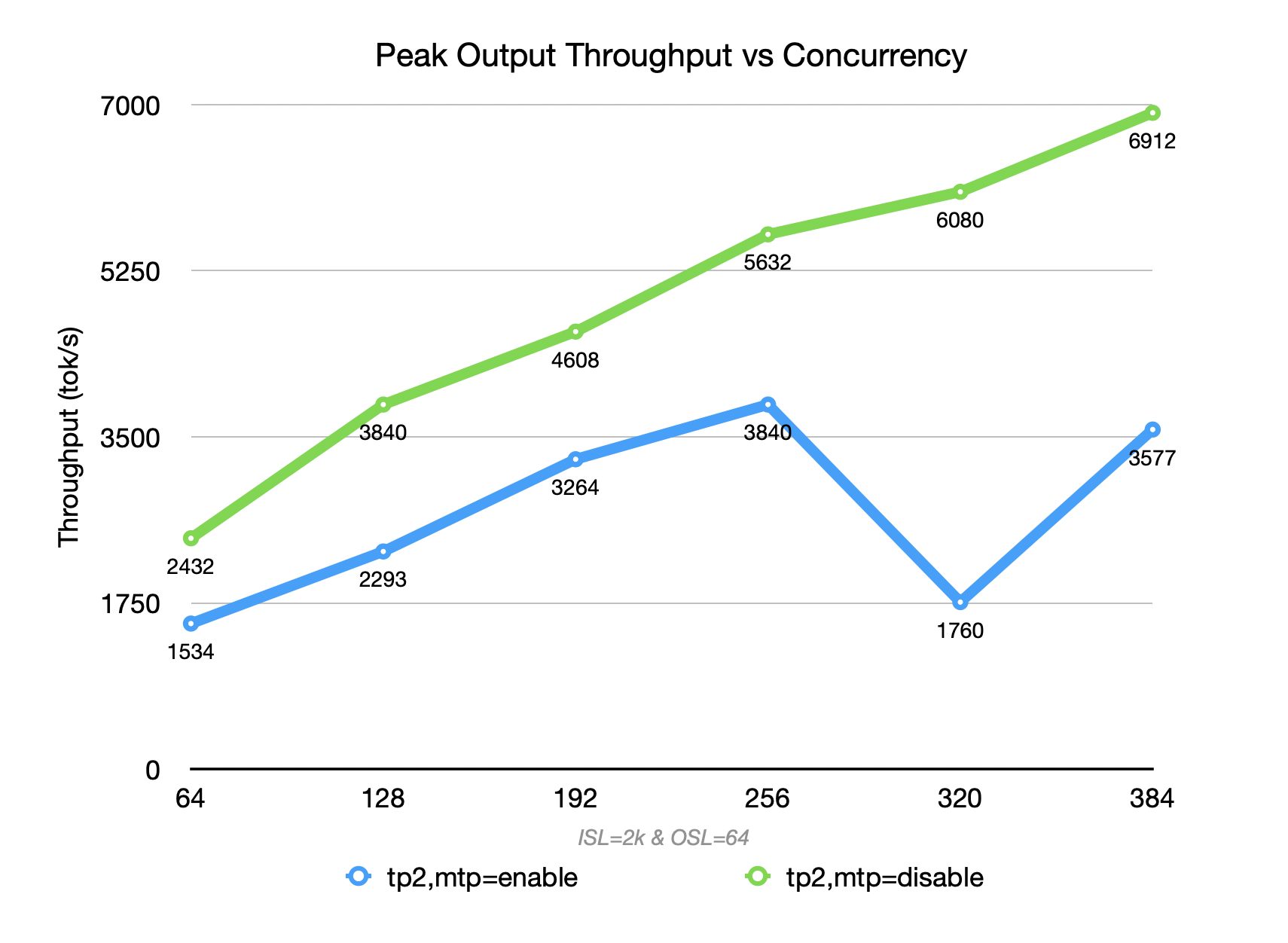 Therefore, the overall throughput is lower than that achieved with MTP disabled at both low and high concurrency levels.