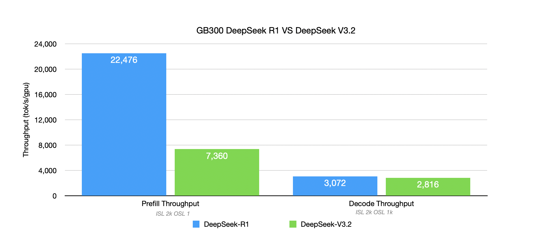 As shown in the chart below, with the same GB300 setup, DeepSeek R1’s Prefill throughput capability is ~ 3x that of DeepSeek V3.2.