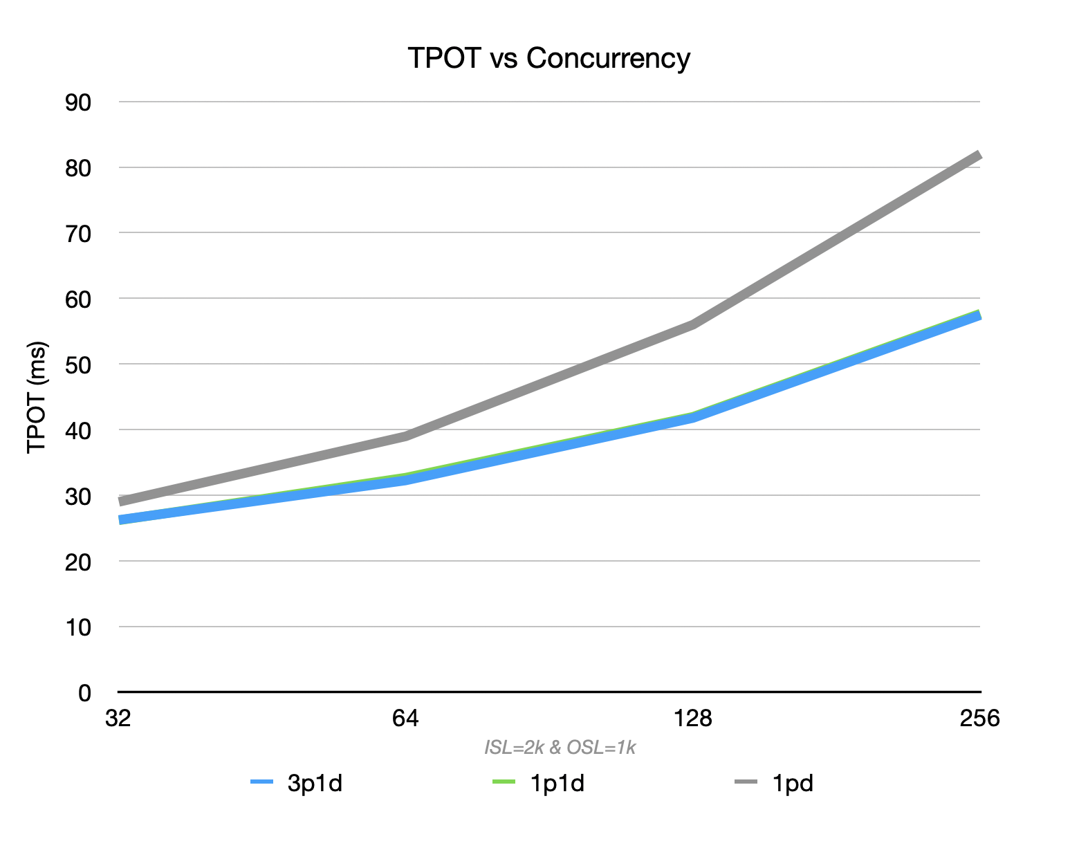 Regarding TPOT, both 1P1D and 3P1D outperform the non-disagg setup. At 256 batch, the disagg setup suppresses TPOT within 60ms, while the integrated setup exceeds 80ms.